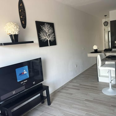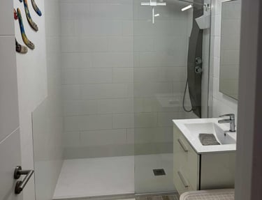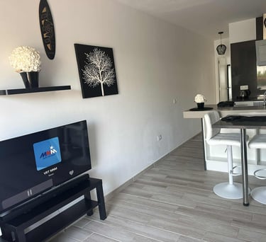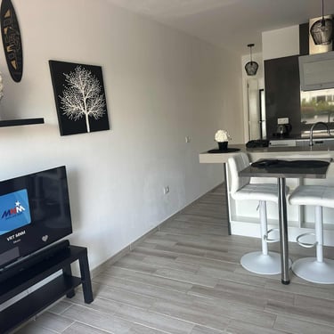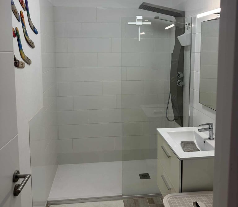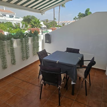 Buiten vind je een privéterras met tafel en vier stoelen, evenals een uitschuifbare zonneluifel (toldo) voor extra schaduw. Via het terras betreed je ook het appartement.