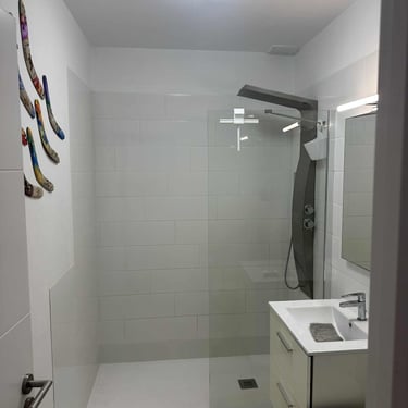 De badkamer is ingericht met een hang WC, een lavabo, ruime inloopdouche, haardroger en weegschaal. Standaard badlinnen is ook ruimschoots aanwezig.